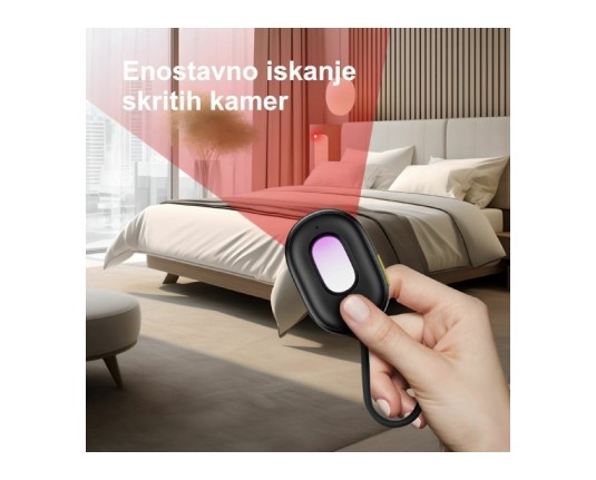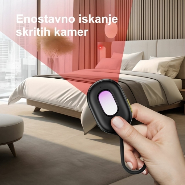 Ob zaznavi skritih kamer ali vsiljivcev opozori z zvokom, rdečo lučjo in vibracijo.