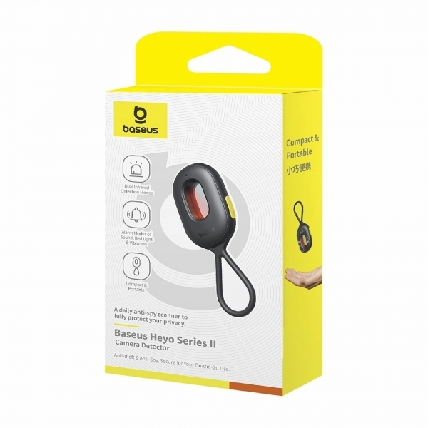Baseus L60476900111-00 detektor skrite kamere z alarmom Heyo Series 2 omogoča zaznavanje prek infrardeče in optične tehnologije. Za iskanje skritih kamer uporablja infrardečo svetlobo, zvok ali vibracijo. Uporabi se lahko tudi na kljuki vrat kot alarm proti vsiljivcem ali LED svetilka. Kompakten in uporaben detektor s 60mAh baterijo. Za optimalno uporabo mora biti uporabljen v temi, saj ga sončna svetloba lahko zmoti.