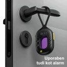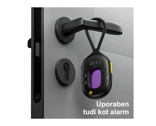Omogoča funkcijo s katero ob namestitvi na kljuko vrat ali oken zazna premikanje in sproži glasen alarm z utripajočo rdečo lučjo.
