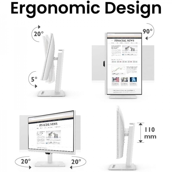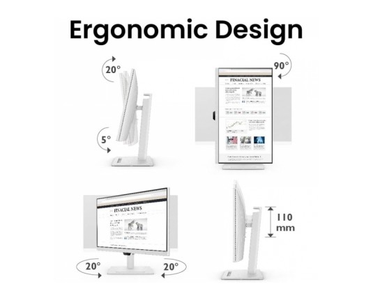 Ergonomska zasnova omogoča enostavno prilagajanje višine, nagiba, vrtenja in obračanja monitorja, kar povečuje učinkovitost v idealno udobnem uporabniškem okolju. Oglejte si celotno sliko in uživajte v slikah v njihovem polnem kontekstu.
