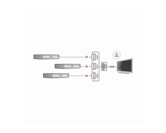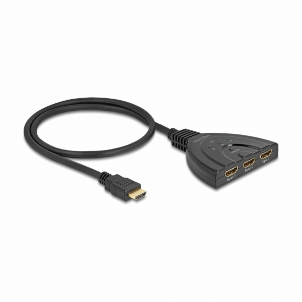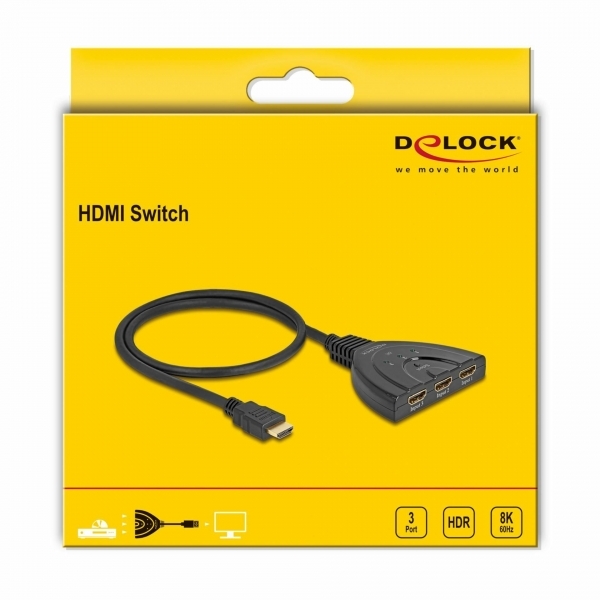Delock HDMI stikalo 3x1 8K 60Hz 18649 omogoča povezavo do treh HDMI naprav na en zaslon, TV ali projektor. Z gumbom na ohišju lahko enostavno preklapljate med priključenimi napravami. Podpira ločljivost do 8K @ 60 Hz za vrhunsko kakovost slike in je idealna rešitev za domači kino ali delovno okolje.