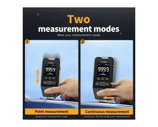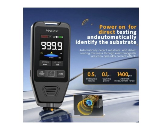 FNIRSI CTG-20 je merilnik debeline barve in laka za preverjanje kovinskih površin z visoko natančnostjo. Naprava samodejno prepozna vrsto podlage (jeklo, aluminij, cink) in uporablja elektromagnetno indukcijo ter vrtinčne tokove za zanesljive rezultate. Omogoča enkratni ali neprekinjeni način merjenja, s prikazom trenutnih, maksimalnih, minimalnih in povprečnih vrednosti.