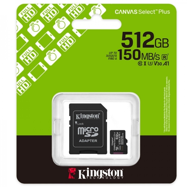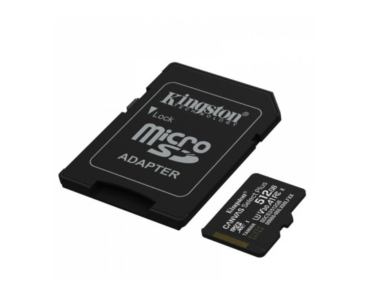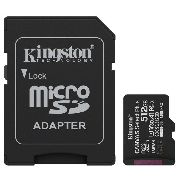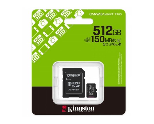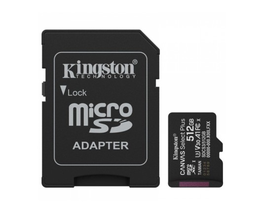 KINGSTON Canvas Select Plus microSD 512GB Class10 UHS-I SD adapter SDCS3/512GB spominska kartica je izvrsten medij za shranjevanje vaših slik, videoposnetkov, glasbe in ostalih podatkov. Kartica je zelo odporna na zunanje vplive, zato jo boste lahko brezskrbno uporabljali v vseh pogojih. Omogoča hrambo podatkov do kapacitete 512GB ter zagotavlja visoke hitrosti zapisa ter branja.
