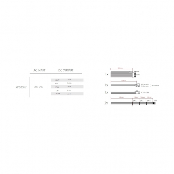 Izhodne napetosti: +3.3V 24A, +5V 24A, +12V 38A, -12V 0.5A, +5VSB 2.5A