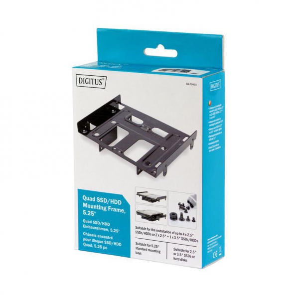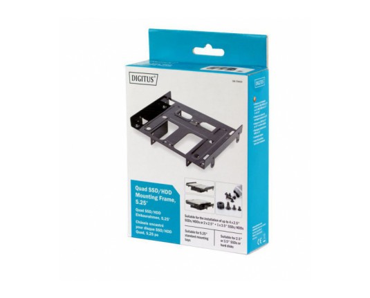 Nosilec za SSD/HDD Digitus omogoča namestitev 4x 6cm (2.5) SSD/HDD disk ali 1x 9cm (3.5) + 2x 6cm (2.5) SSD/HDD disk v 13cm (5.25) prostor v ohišju.