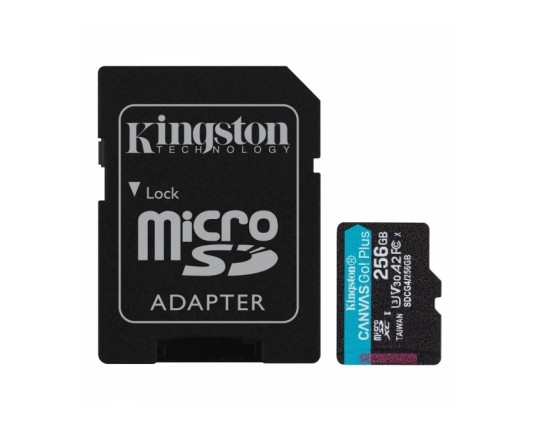 SPOMINSKA KARTICA KINGSTON MICRO 256GB CANVAS GO PLUS je kakovosten medij, ki bo poskrbel za zanesljivo shrambo vaših podatkov. Spominska kartica brez težav prenaša vibracije in udarce, odporna pa je tudi proti okoljskim vplivom. Podatki na njej bodo takoj zmeraj varni. Na njej je mogoče hraniti do podatkov, omogoča pa visoke hitrosti prenosa.