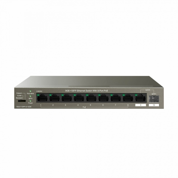 Tenda TEG1110PF-8-102W je 9 portno Gigabit stikalo iz kovinskega ohišja z vmesniki 8x 1000Mbps PoE izhodi s skupno močjo 92W (IEEE 802.3af/at do 30W/vrata). Za UpLink lahko uporabite Combo Giga ethernet ali SFP priklop. Stikalo je idealno za napajanje PoE kamer, ki se uporabljajo za video nadzor objektov.